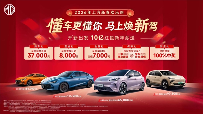 延续2025年的热销势头,MG在开年即推出“10亿红包”大规模用户回馈活动,有力彰显了品牌把握市场节奏的信心与持续乘势而上的决心。2026年,MG将陆续投放多款新能源车型,以技术为基、用户为本,继续完善产品矩阵,稳步推进品牌在智电时代的全面焕新与向上突破。